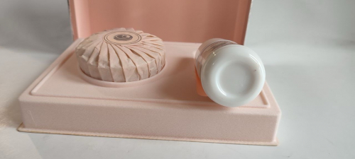 Мило з цього сету не лише очищає шкіру, але й залишає на ній легкий ароматний серпанок. Його текстура ніжна, мов шовк, а запах – це м’який акорд квітів із легким деревним відлунням. Воно підходить для щоденного використання, додаючи моменту догляду нотку розкоші.