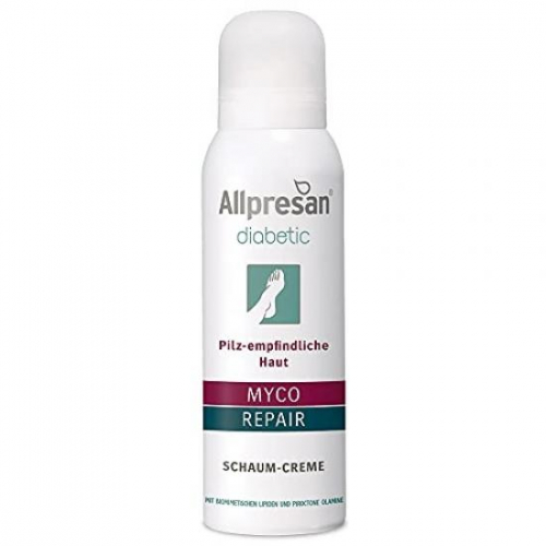 Крем-пінка для діабетиків Allpresan MYCO + REPAIR - це ідеальний засіб для догляду за чутливою шкірою стоп та захисту від мікозу при діабеті. Завдяки запатентованій технології, яка зміцнює фізіологічний бар'єр шкіри, крем-пінка запобігає виходу вологи, утворюючи захисну сітку, що дихає, не порушуючи природних функцій шкіри.