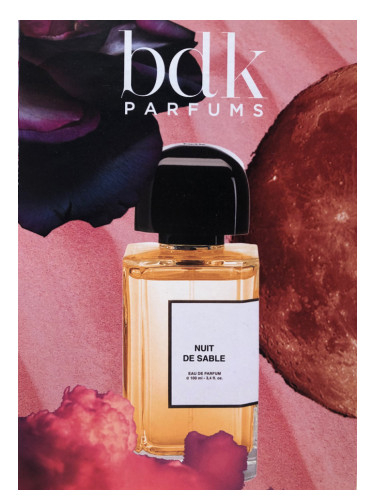 Nuit De Sable від BDK Parfums - це унісекс аромат, який належить до групи нішевих парфумів. Цей аромат був випущений у 2019 році парфумером Marie Schnirer. Верхні ноти складаються з кардамону з Гватемали, мускатного горіха та сандалу; середні ноти - з турецької троянди, троянди та піску; базові ноти - з тонка бобів, мускатного горіха, амброксану та мускусу.