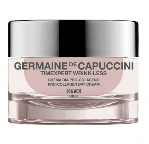 Іспанська професійна косметика Germaine de Capuccini пропонує інноваційний засіб для догляду за шкірою обличчя, шиї та зони декольте – денний крем timexpert wrink-less pro-collagen day cream spf30 rich, який стане ідеальним доповненням до вашого щоденного ритуалу краси. Цей крем розроблений з урахуванням потреб сухої та дуже сухої шкіри, забезпечуючи їй комплексний захист від зморшок та вікових змін.